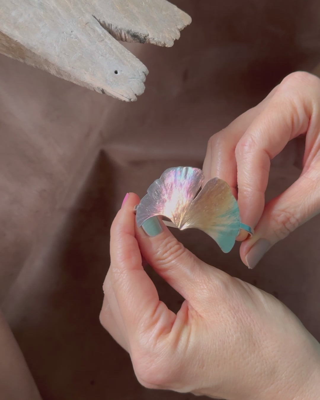 Die Blätter werden in meinem Atelier mit Recyclingsilber stabilisiert und bei fast 1.000°C gebrannt. Das Ergebnis ist ein robustes Schmuckstück, das dich viele Jahre begleitet – achtsam gefertigt, leicht zu tragen und trotzdem stabil.