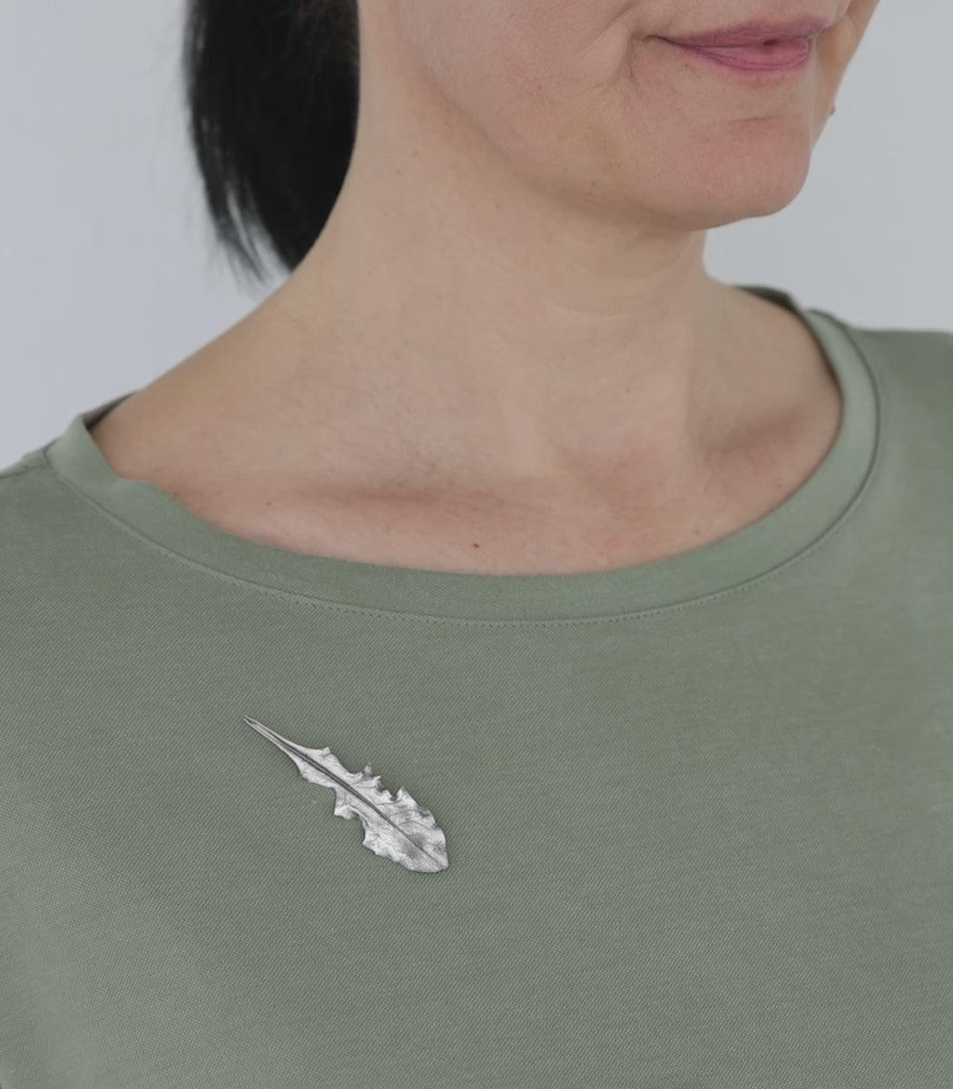 Wear this stunning brooch and feel the connection to nature expressed through every detail of the dandelion leaf. The delicate structure and filigree lines tell a story of grace and vitality that you can proudly display. Discover the uniqueness and beauty of nature with our dandelion leaf brooch and let yourself be enchanted by its charm. Order your personal one-of-a-kind piece today and wear a piece of natural art that will bring you lifelong joy.