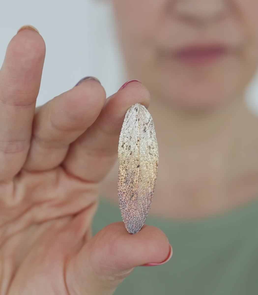 Die Blätter werden in meinem Atelier mit Recyclingsilber stabilisiert und bei fast 1.000°C gebrannt. Das Ergebnis ist ein robustes Schmuckstück, das dich viele Jahre begleitet – achtsam gefertigt, leicht zu tragen und trotzdem stabil.
