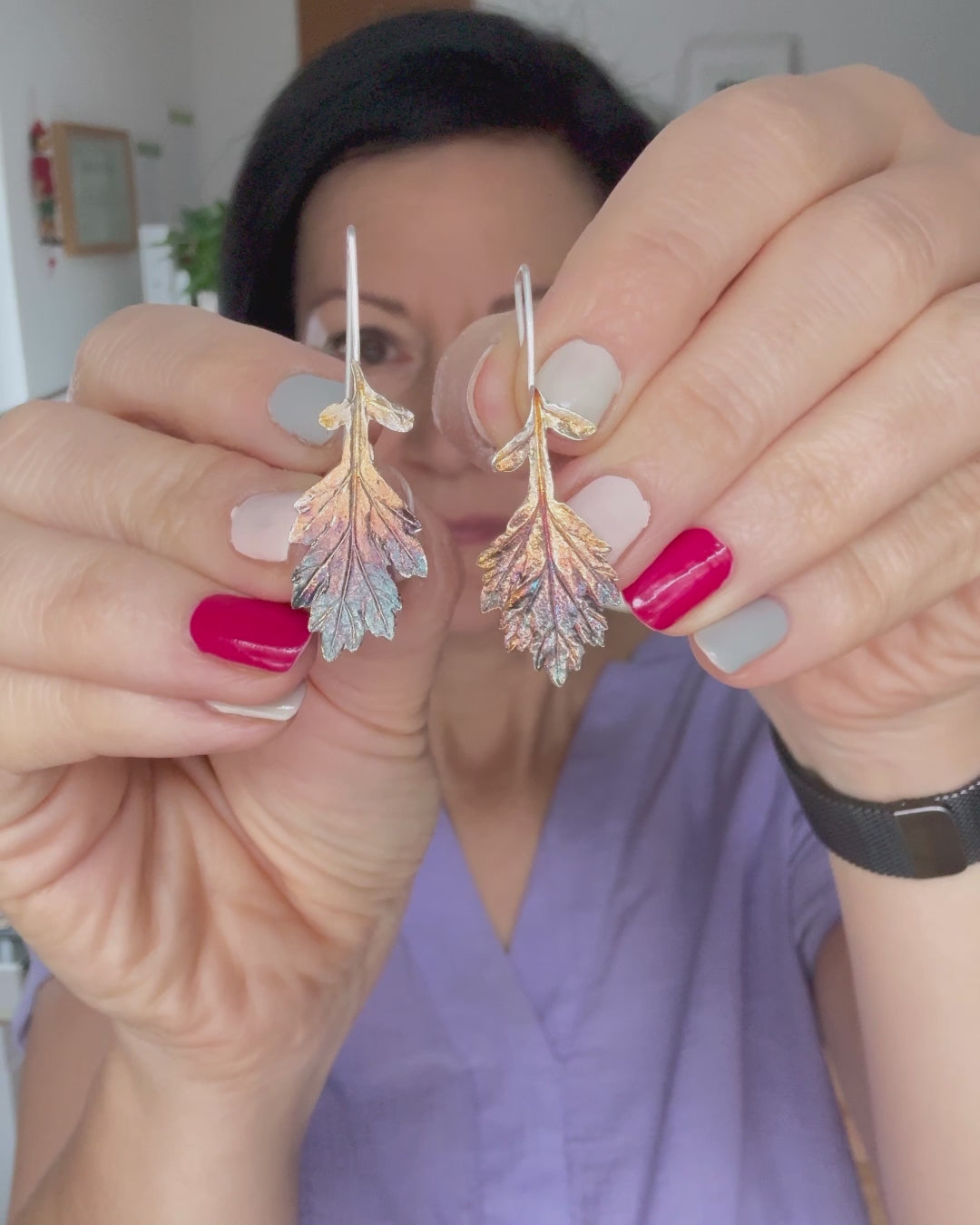 Die Blätter werden in meinem Atelier mit Recyclingsilber stabilisiert und bei fast 1.000°C gebrannt. Das Ergebnis ist ein robustes Schmuckstück, das dich viele Jahre begleitet – achtsam gefertigt, leicht zu tragen und trotzdem stabil.
