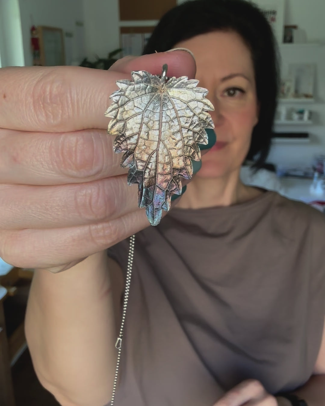 Die Blätter werden in meinem Atelier mit Recyclingsilber stabilisiert und bei fast 1.000°C gebrannt. Das Ergebnis ist ein robustes Schmuckstück, das dich viele Jahre begleitet – achtsam gefertigt, leicht zu tragen und trotzdem stabil.