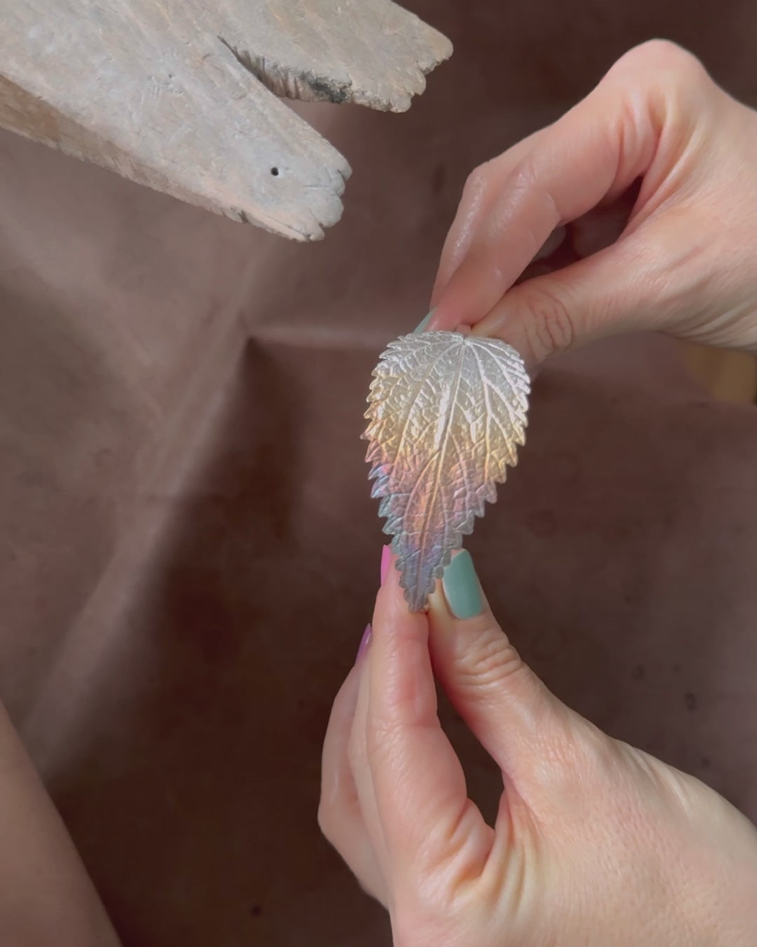 Die Blätter werden in meinem Atelier mit Recyclingsilber stabilisiert und bei fast 1.000°C gebrannt. Das Ergebnis ist ein robustes Schmuckstück, das dich viele Jahre begleitet – achtsam gefertigt, leicht zu tragen und trotzdem stabil.