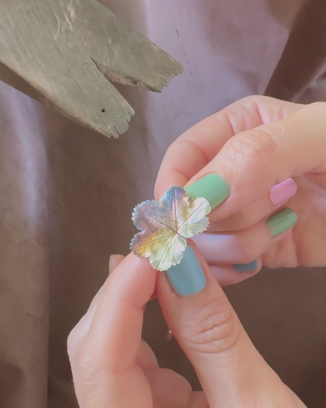 Die Blätter werden in meinem Atelier mit Recyclingsilber stabilisiert und bei fast 1.000°C gebrannt. Das Ergebnis ist ein robustes Schmuckstück, das dich viele Jahre begleitet – achtsam gefertigt, leicht zu tragen und trotzdem stabil.