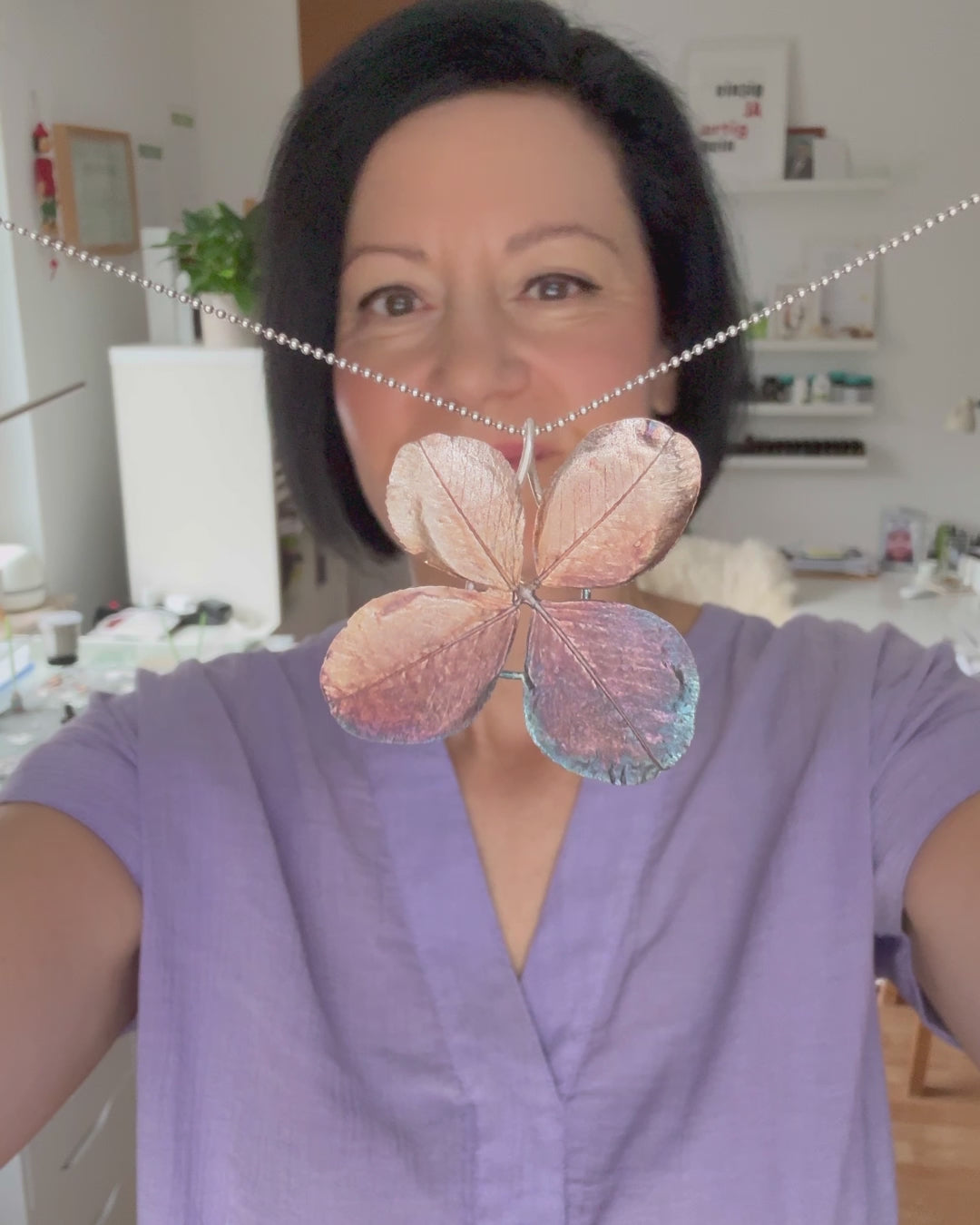 Die Blätter werden in meinem Atelier mit Recyclingsilber stabilisiert und bei fast 1.000°C gebrannt. Das Ergebnis ist ein robustes Schmuckstück, das dich viele Jahre begleitet – achtsam gefertigt, leicht zu tragen und trotzdem stabil.